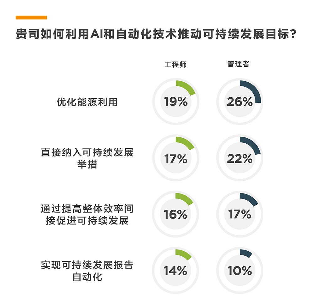 除了推动创新、创造财务收益外,AI在能助力企业实现可持续发展目标方面同样能发挥重要作用。事实上,几乎所有受访者 (99%) 都表示,他们正以某种方式利用AI和自动化技术来推动企业的可持续发展。